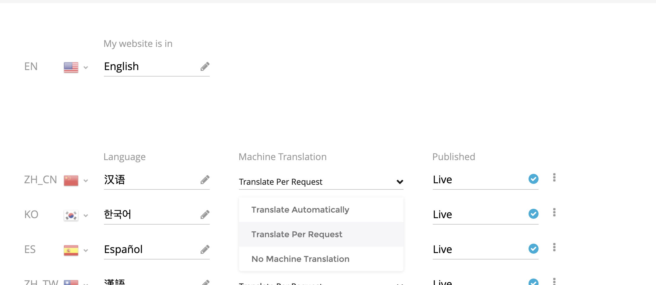 No Machine Translation: Choose this if you prefer manual translation over machine translation. This means no automatic translations will be performed, and all translations must be entered manually.